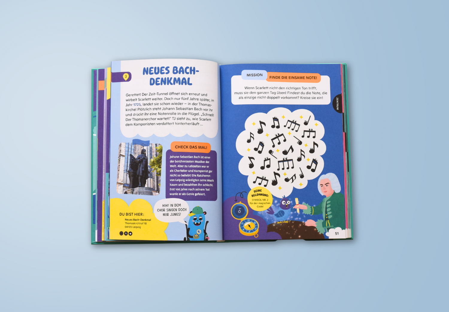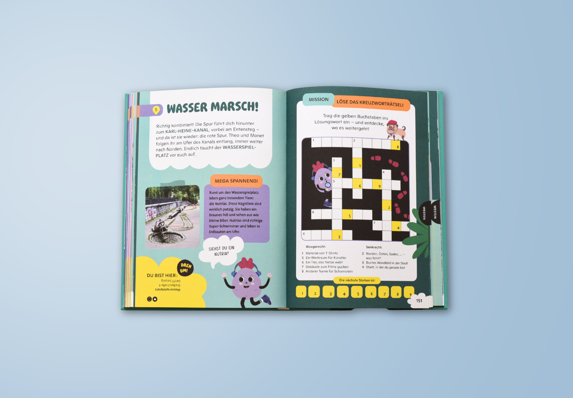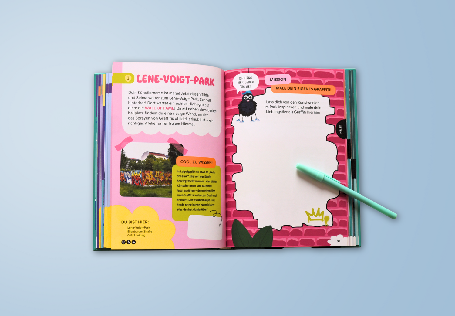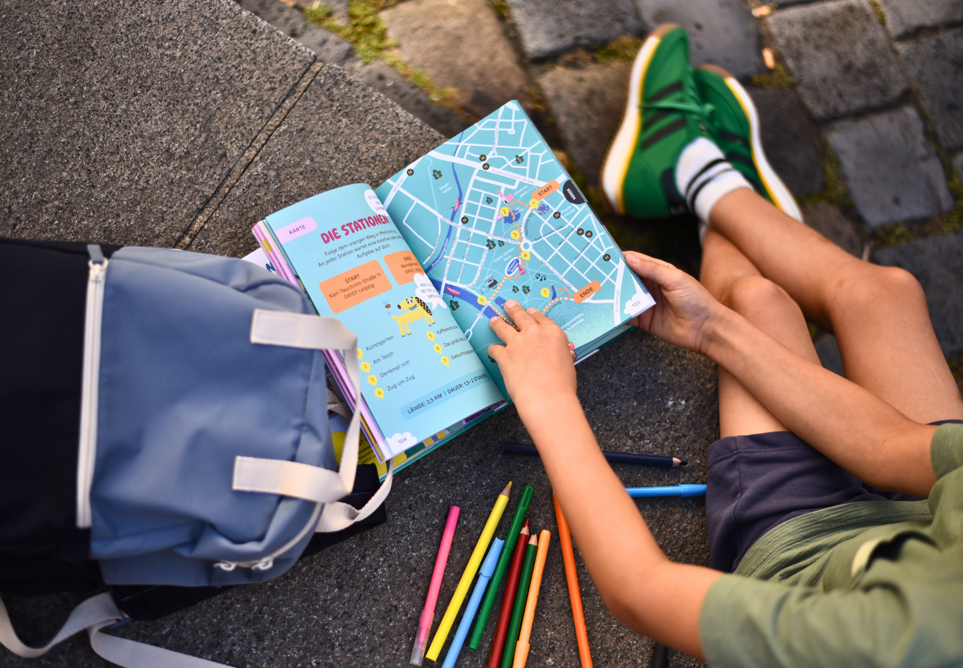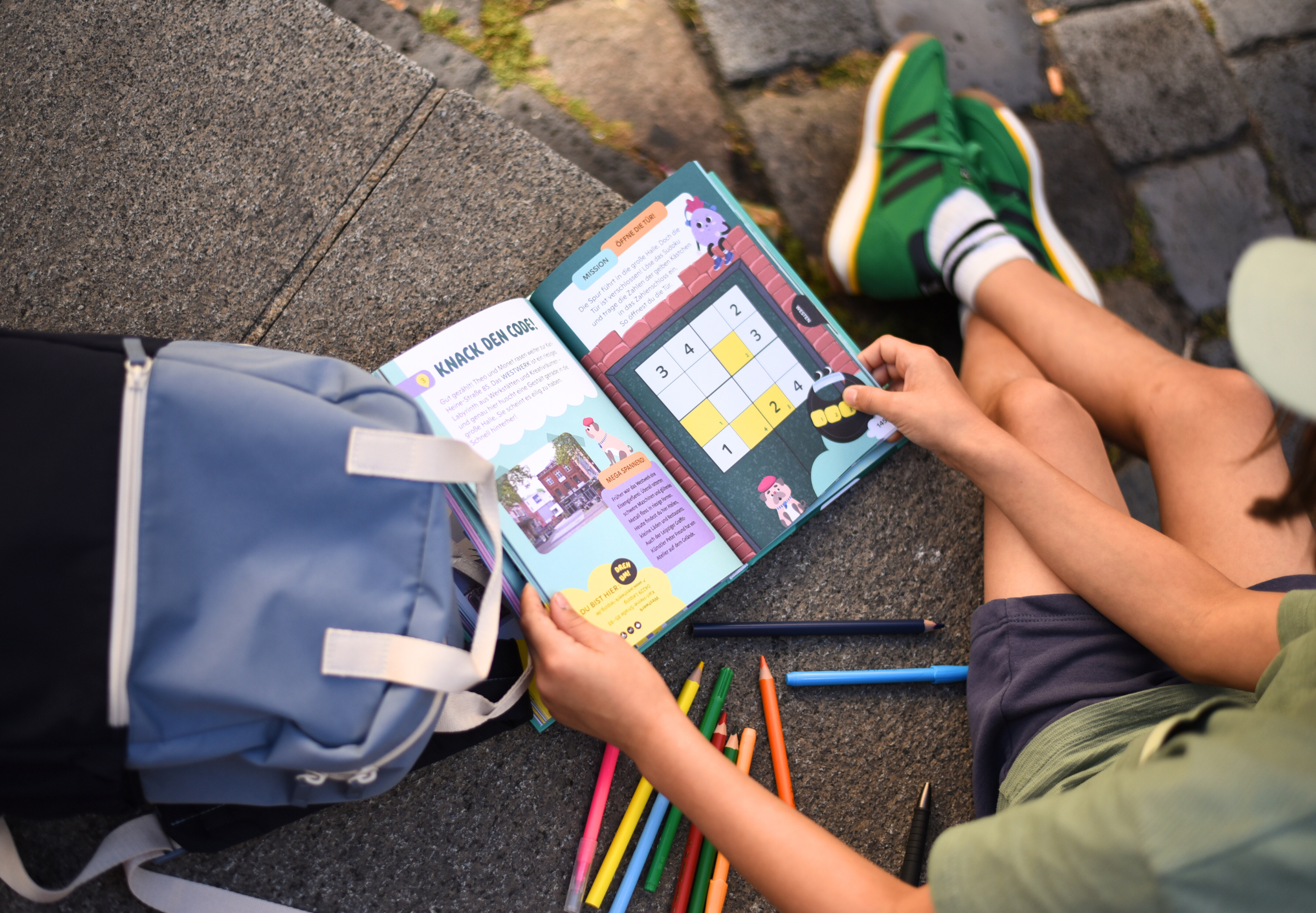 Neben Rätseln warten viele Kreativaufgaben auf dein Kind. Beim Malen und Zeichnen kann es seiner Fantasie freien Lauf lassen. Das sorgt für bunte Abwechslung und macht die Stadttour zu einem Erlebnis voller Kreativität.
